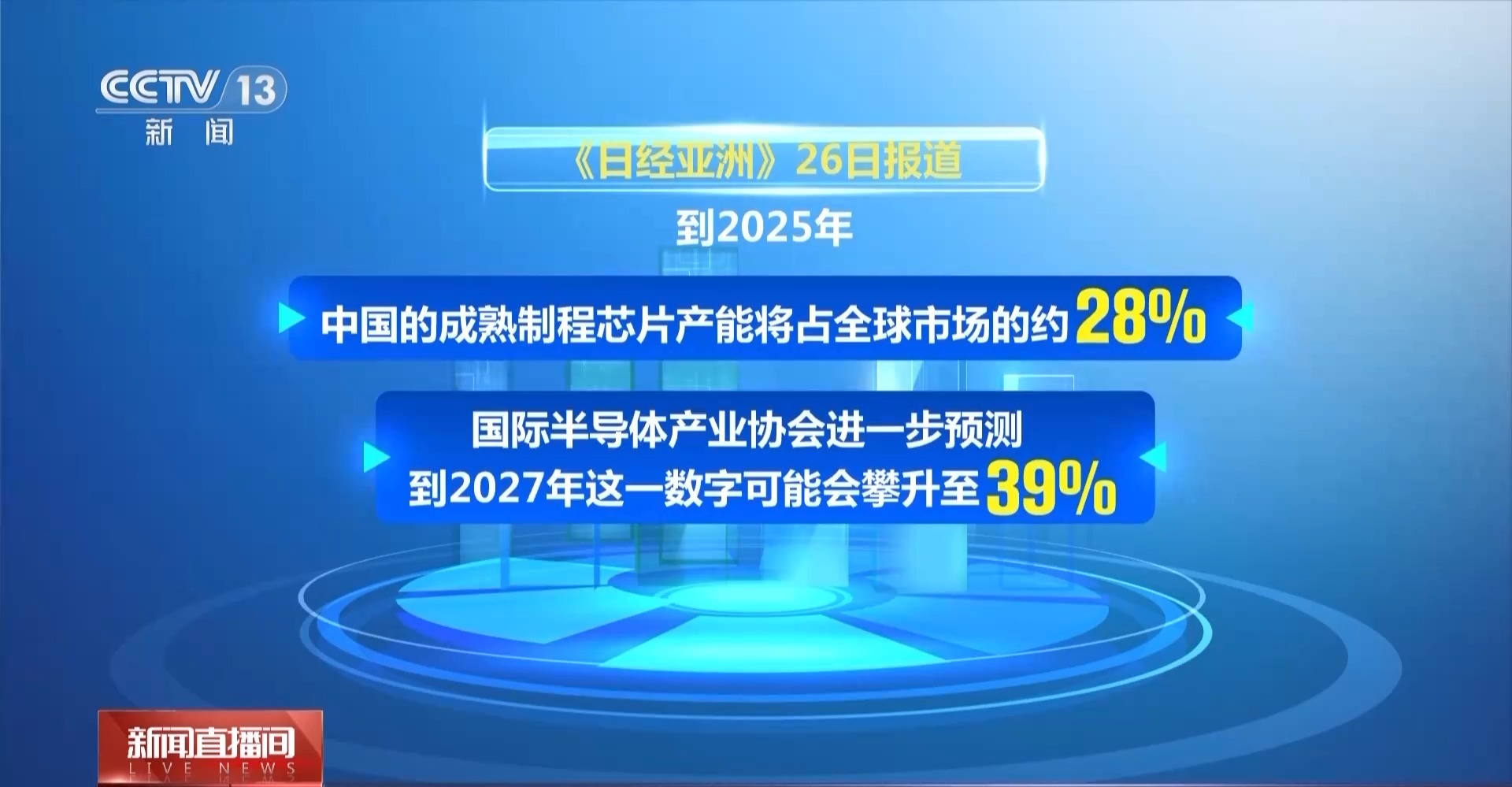 《日经亚洲》26日也报道称,到2025年,中国的成熟制程芯片产能将占寰球市场的约28%。国际半导体工业协会进一步猜测,到2027年这一数字可能会攀升至39%。