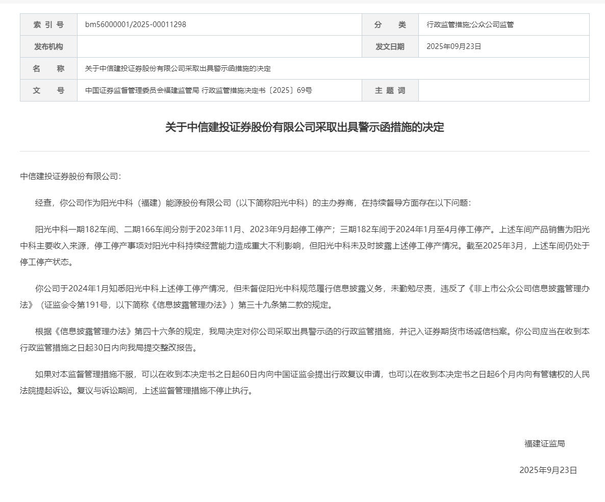 中国经济网络北京,9月29日,福建证券监管局最近与CITIC Construction Investment Securities Co,Ltd发出了一份警告信。调查后,Citic Construction Investment Cearvies Co,Ltd,作为Sunshine Zhongke(Fujian)Energy Co,Ltd。的赞助商经纪人(从阳光Zhongke上发出),正在进行的政府存在以下问题:Sunshine Zhonge Zhonge ease 1 182 Workshop and 2 166阶段的工作持续时间为266阶段,涉嫌从11月20日进行了暂停,并于9月202日暂时2023年12月20日。 2024年1月至4月。工作和生产的暂停纳格特尔对阳光宗继续运营的能力是一个重大的不利影响,但阳光中心尚未透露上述悬架的悬架及时工作和工作。 2025年3月,上述研讨会仍处于工作和劳动中的停职状态。 Citic Construction Investment Securities Co,Ltd. 191,因此称为“信息管理条例”)。根据“管理信息指标”第46条,福建证券监管局已决定采取行政行政措施向CITIC Construction Investment Investment Co.,Ltd。发出警告,并将其记录在安全完整性文件和期货市场中。以下是原始文本: