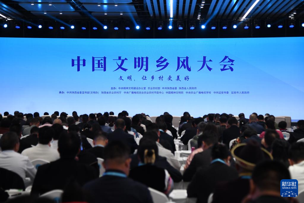 这是10月29日召开的中国乡村风采大会主会场。围绕“文明,让乡村更美好”的主题,中国乡村风采大会于10月29日至30日在陕西省延安市举行。大会由中央精神文明建设办公室、农业农村部、中共陕西省委、陕西省政府主办。它主要分为三个主要部分。首先是该地区的主要活动。同时,围绕现代党性理论进村入户、深化乡村风俗传承、发展“村名”文化体育、保护和建设四个主题,设置了四个分会场。乡村文化遗产的价值。二是在全国范围内实施优秀风俗文化艺术节目集中演出。三是举办“村BA”群众体育交流活动,展示“村冠”文体活动成果。新华社记者 张博文 摄